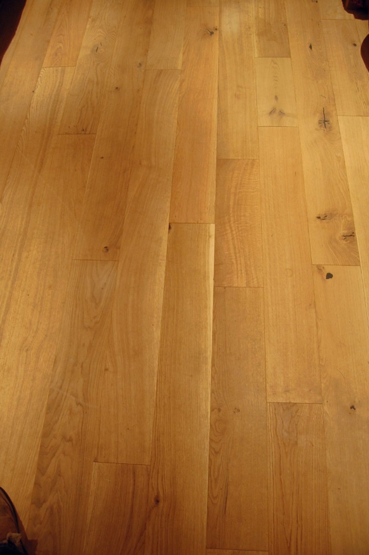 I have laid many laminate, engineered and solid wood floors in my time and on arrival I opened up half the boxes to get an overview of consistency and to order the boards in length and to sort out any boards which if necessary I could ‘hide’ in less obvious positions (i.e. large knots, sapwood etc!). I was pleasantly surprised to find that most of the boards were clear of any knots and those that did exist were small, very little sapwood and no single board could be shamed into being hidden.